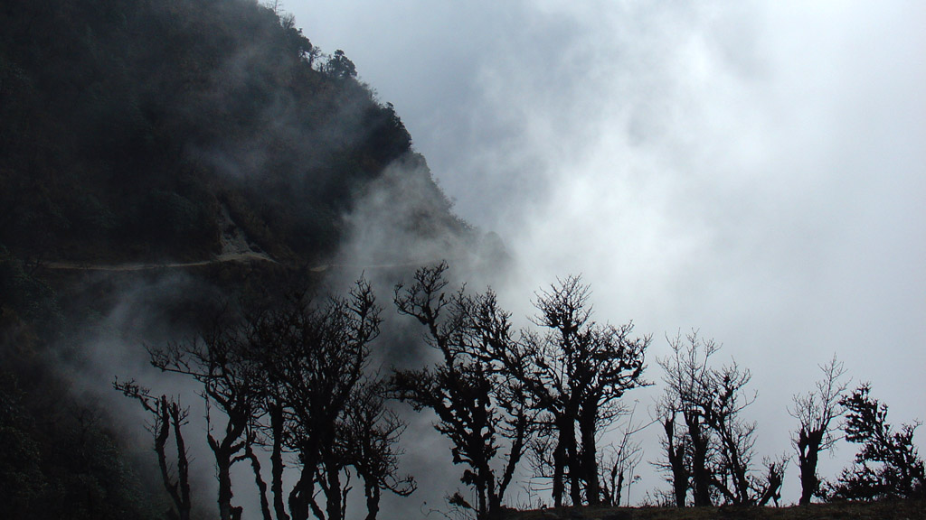 Then, as we passed through this band of fog, we would again find ourselves with bright blue skies and the yellow expanse of a brightly lit alpine meadow. More hills and climbing and the path would slowly course into a cool, dense conifer forest until our glorious, exhausted arrival at the peak of the trip – a trekkers’ hut at a place called Phallut and the site of the most magnificent view I think the three of us had ever witnessed.