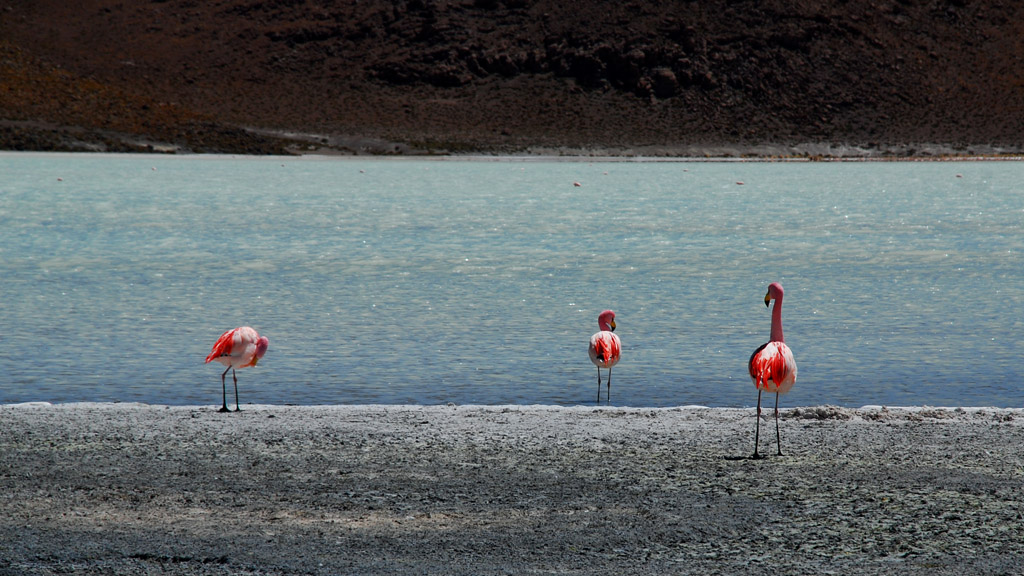 Flamingos watching the shore